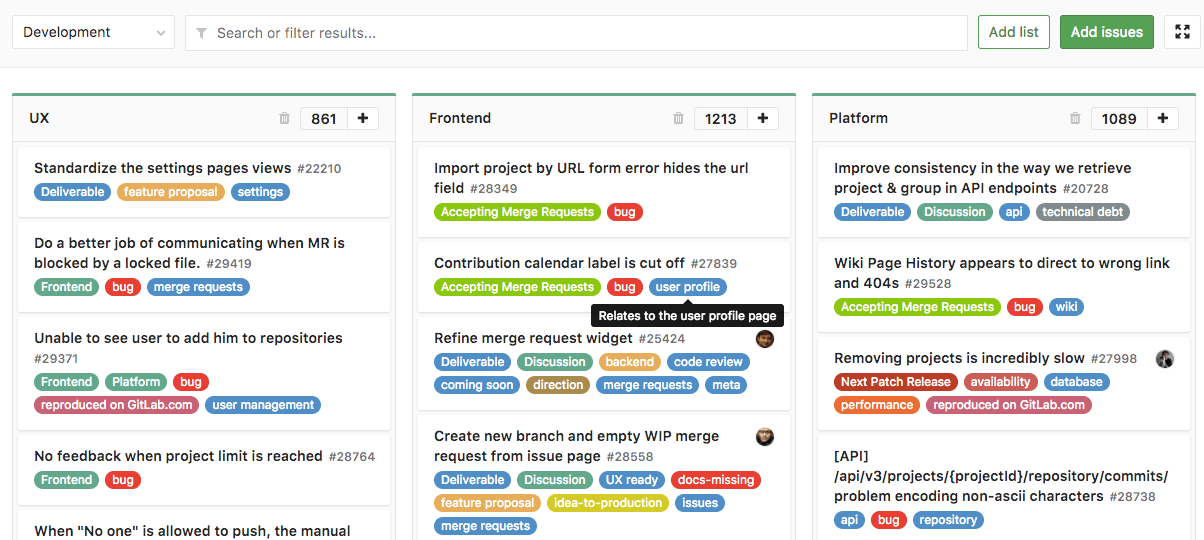 With GitLab Enterprise Edition Starter, you can also create various boards per project with Multiple Issue Boards.